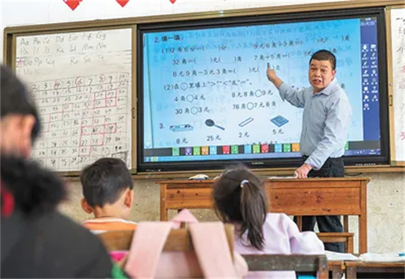 “先比较‘元’,再比较‘角’。所以,这两个数究竟哪个大?”站在那王小学一年级的讲台前,教师黄永勇讲完一个知识点,向孩子们提问。
