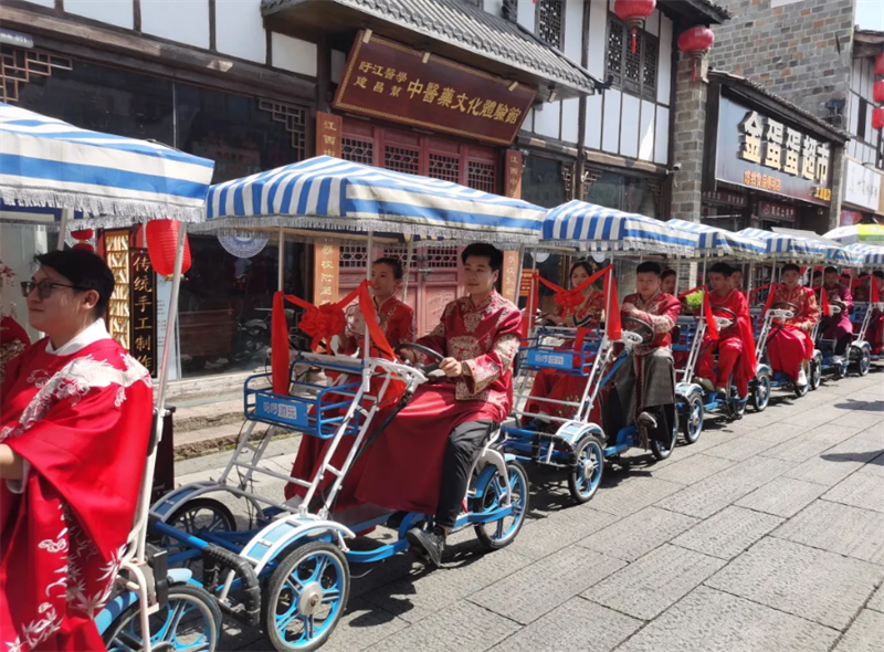 文昌里热闹非凡,抚州市第三届婚恋文化节暨第十一届大型单身男女相亲交友公益活动如约而至。36对新人牵手依次走进集体婚礼现场,他们依次迈过火盆灯、跨过木马鞍后,进行三拜礼、执手礼、盟誓礼,走过鹊桥,体验了一次“穿越千年”的爱情之旅。随后,在优美的歌声中,新人们携手相伴,登上骑行车,携手开启绿色骑行之旅,宣传文明节俭的婚俗新风尚。