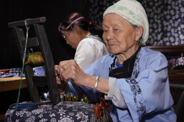 盛夏时节,距离凤凰古城31公里的凤凰县麻冲乡竹山村景区内山峰秀丽,流水潺潺,游人如织。93岁的村民龙妹叭向游客展示编花带技艺,从10岁开始,她就看着妈妈编花带,“因为喜欢,所以自己也学着编,一直编到现在。”