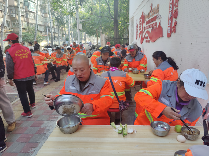 10月14日,石家庄市新华区环卫工人下班后吃上了热气腾腾的早餐。新华网 李然 摄