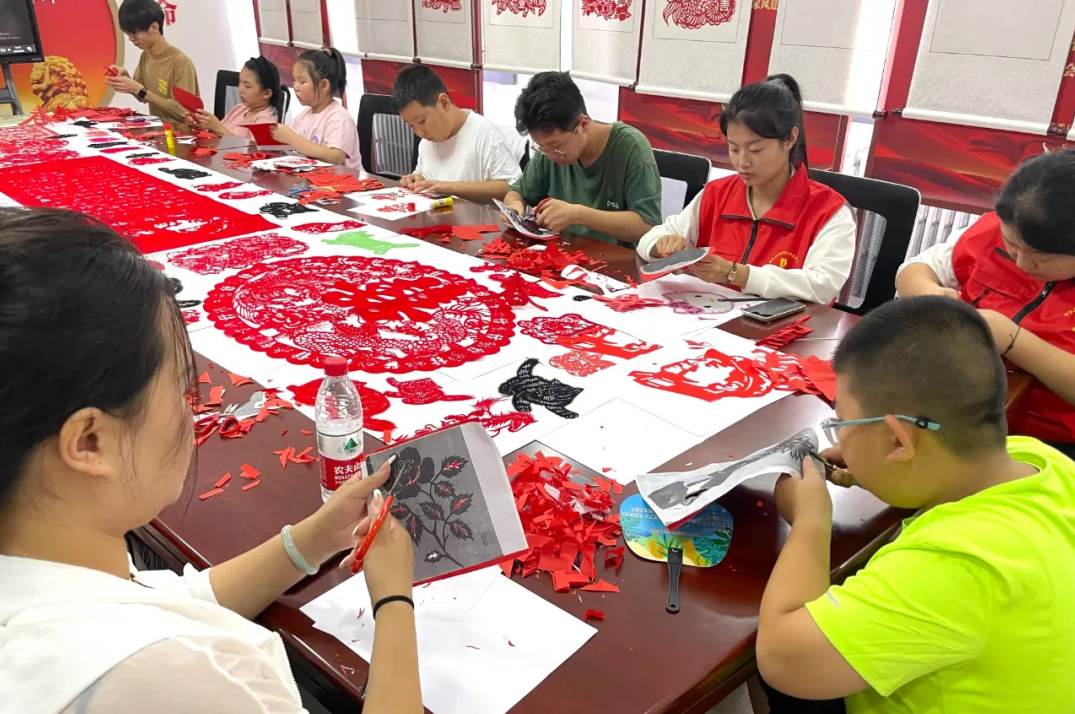 8月8日,静乐县新时代文明实践中心组织青少年学习剪纸技艺,传承传统文化。新华网 任钰 摄